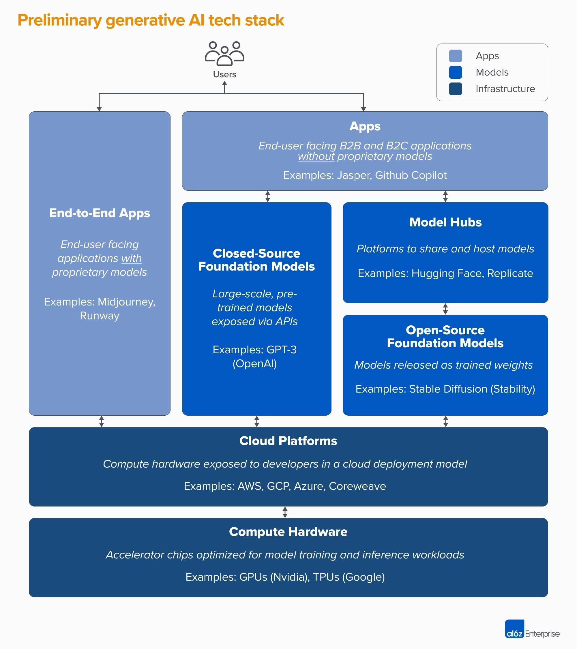 a16z’s blog is often more a source of heat than light, but this post on the shape of the ML market is informative. In particular, I think this diagram helps remind us of where value from open(ish) models may accrue — as much or more to hosting services and platforms than as to end-users?